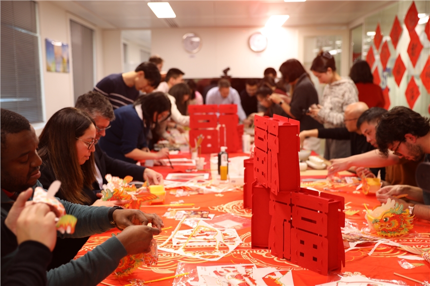 1月27日除夕前日,歐能公司在巴黎總部組織開展了一場春節(jié)特色文化融合活動,中外員工齊聚一堂,其樂融融,共同感受濃厚的春節(jié)文化。活動現(xiàn)場布置溫馨,年味十足。
